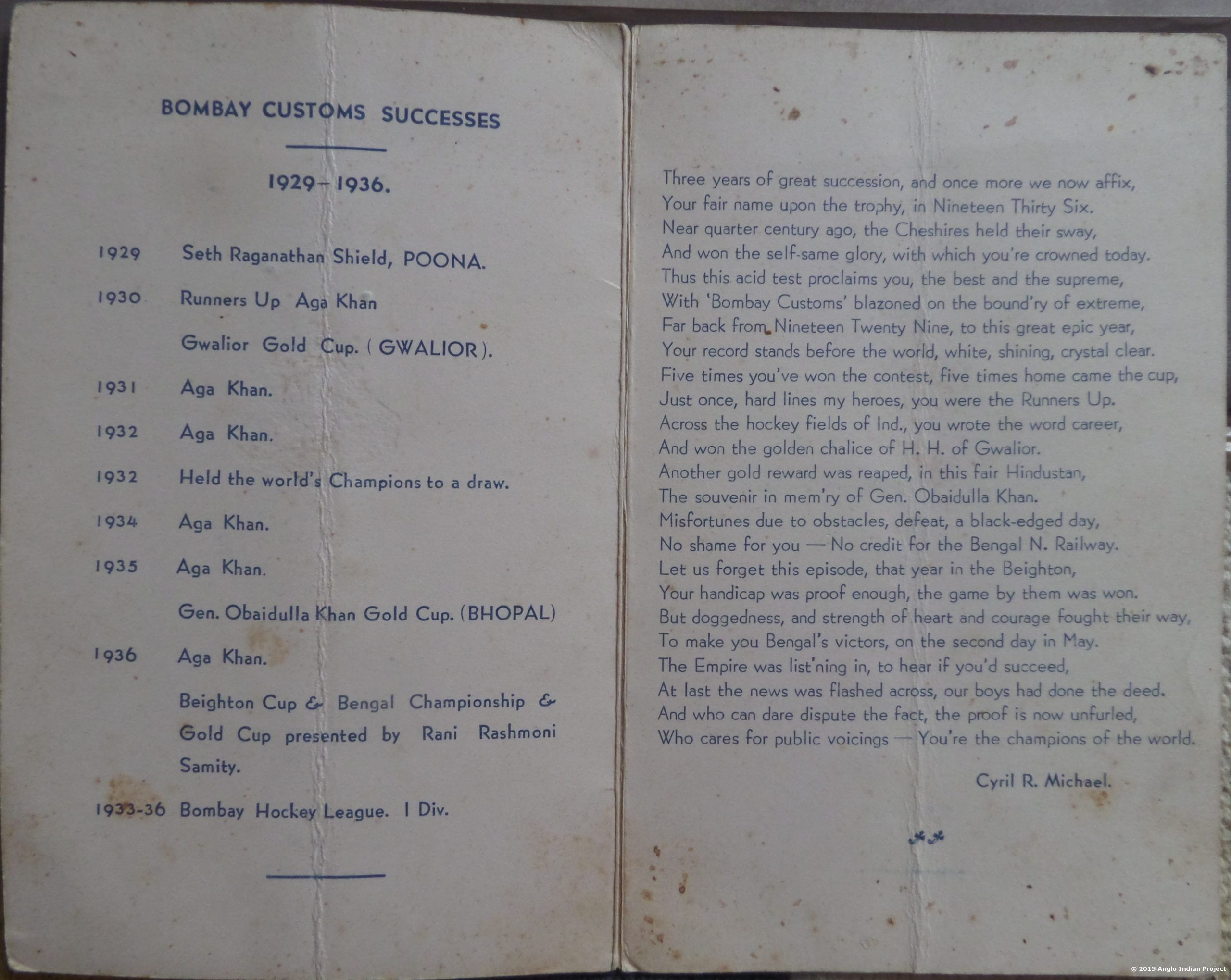 David appears to have been a very successful hockey player for Bombay Customs. As depicted below, between 1929-1936, the Bombay Customs hockey team appear to have taken in a haul of fifteen titles along with many other memorable achievements: